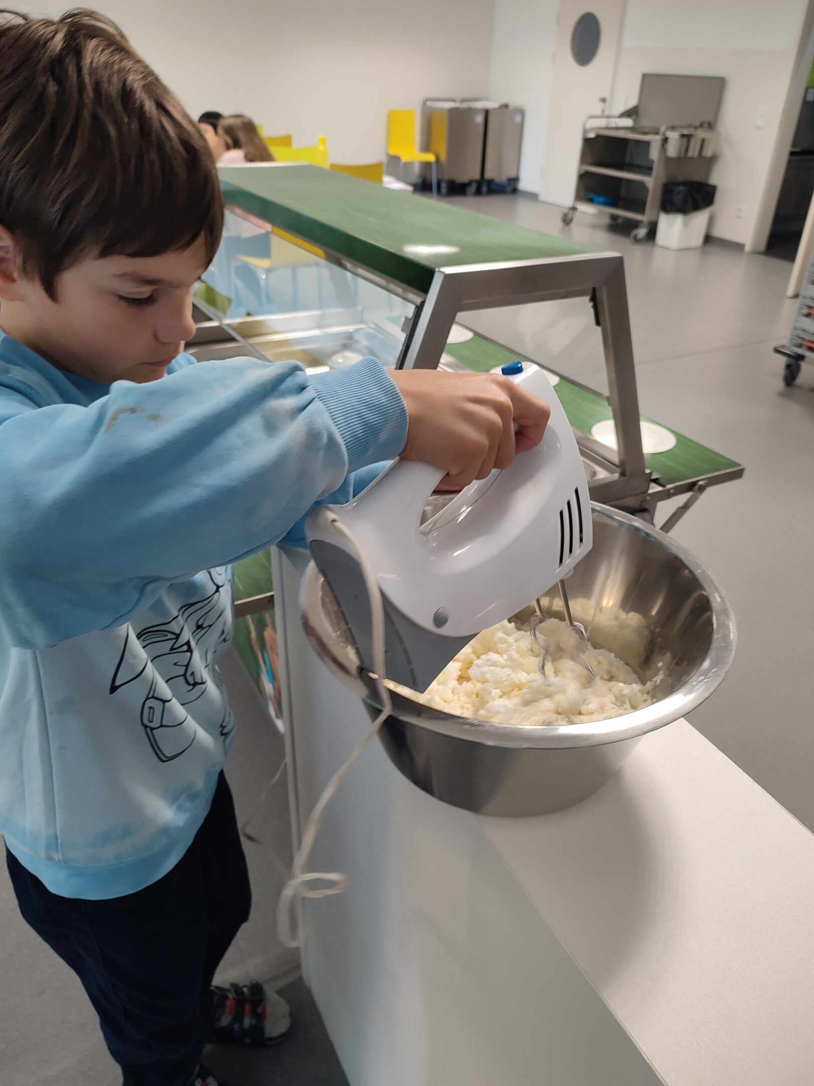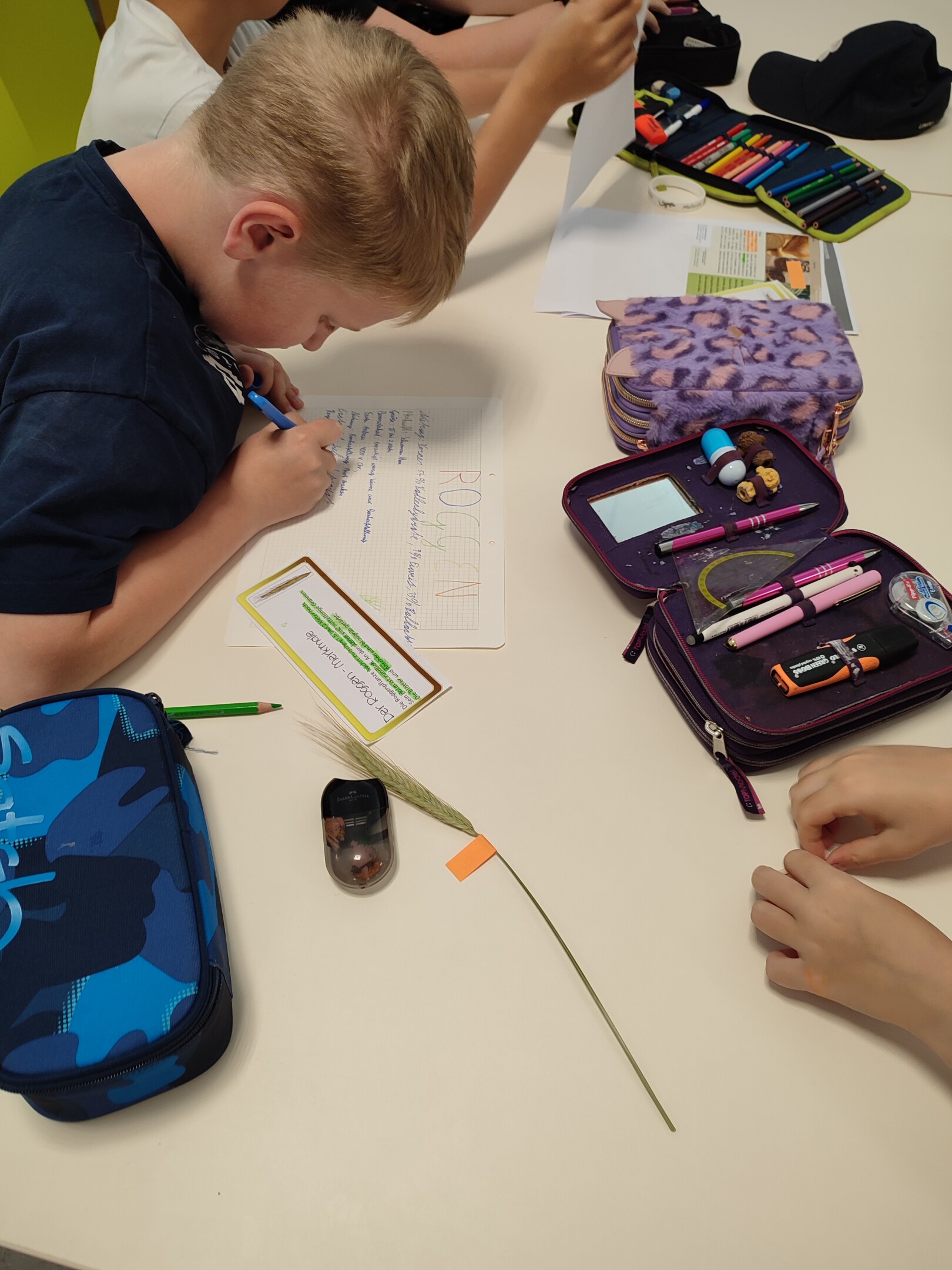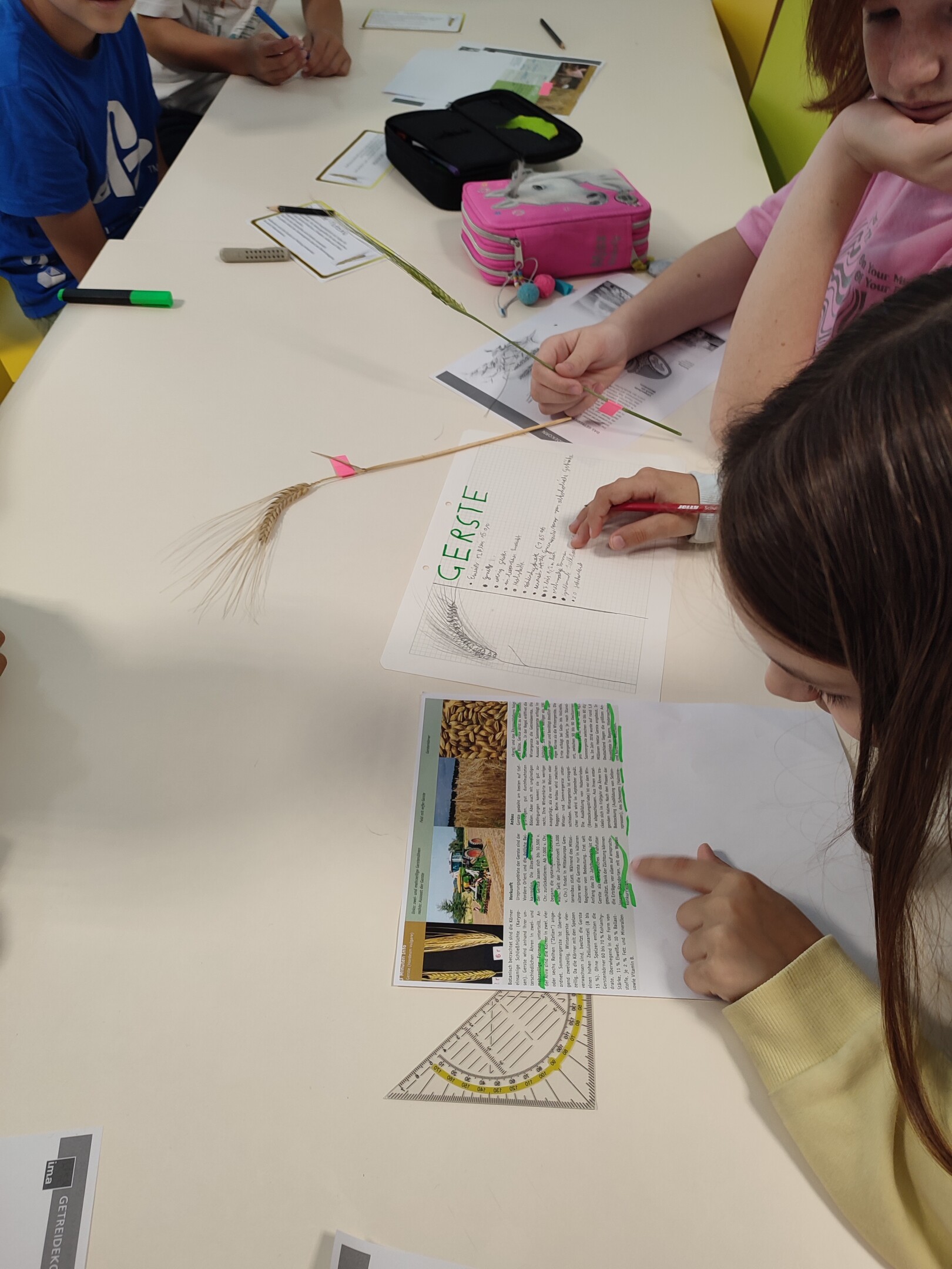 Bereits am Montag, den 19.6., starteten wir in den ersten Stunden im Speisesaal mit dem Thema Getreide. Wir versuchten, Getreidearten von einander zu unterscheiden und den Weg von der Pflanze zum Mehl zu verstehen. Die selbstgemachten Topfenweckerl wurden in 2 Varianten gemacht, gekauftes Weizenmehl und selbst gemahlenes Mehl aus Weizenkörnern, um den Geschmack vergleichen zu können. Vollkornmehl ist im Bezug auf gesunde Ernährung sehr wichtig, dies sollte den Kindern so vermittelt werden.