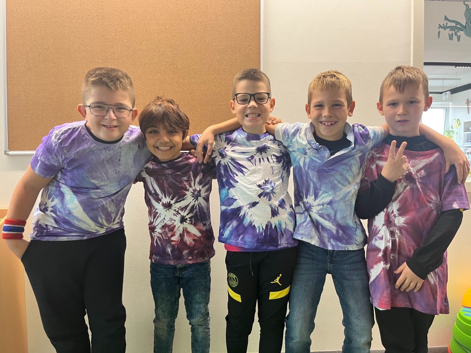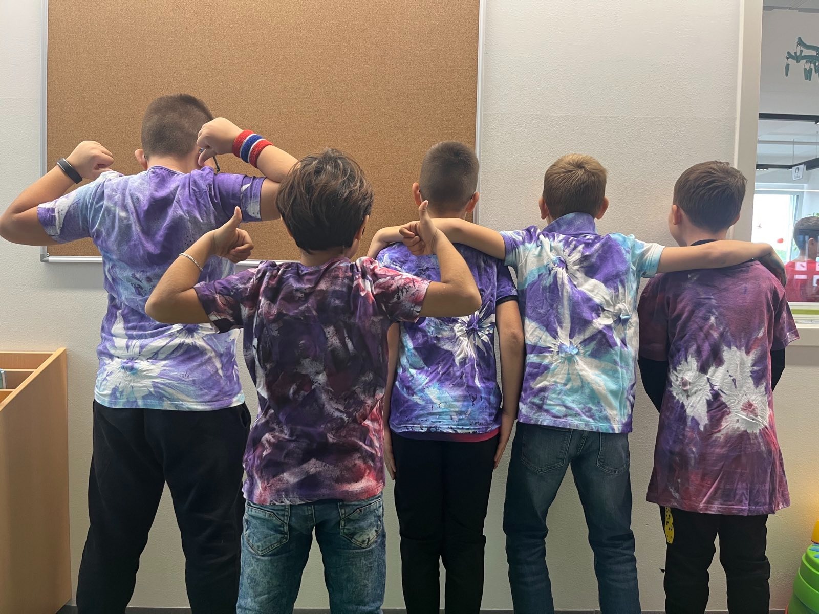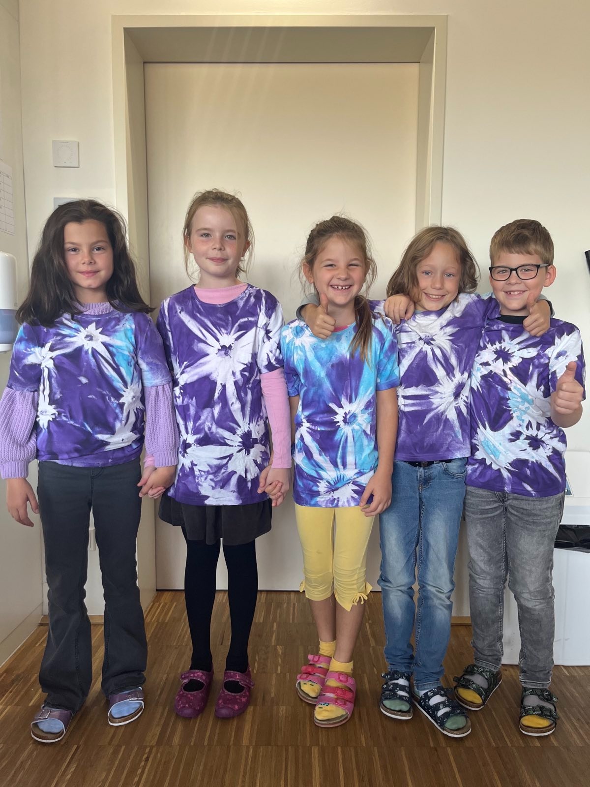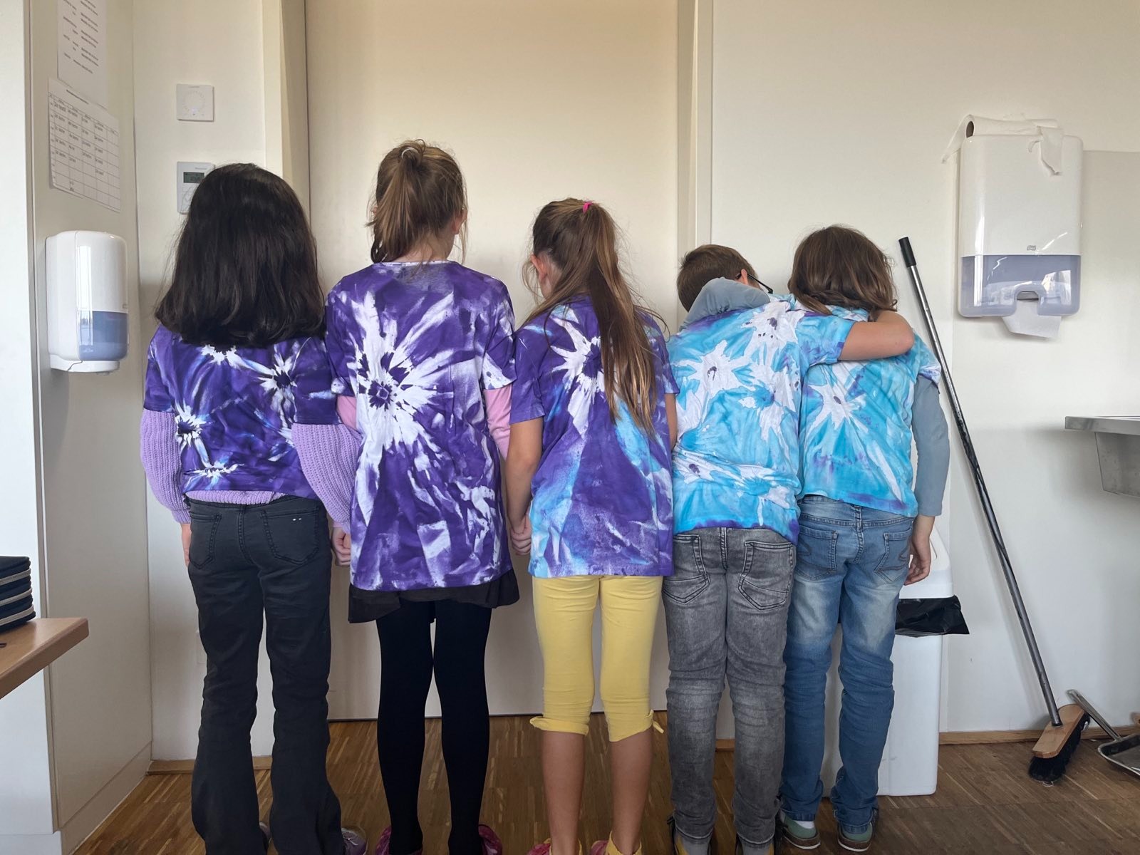 Im Rahmen des Werkunterrichtes gestalteten Kinder der 3B T-Shirts mit individuellem Look. Mit Batikfarben wurden unterschiedliche Färbetechniken ausprobiert und ein Teil der Gestaltung dem Zufall überlassen. Das Endergebnis hat alle überrascht und kann sich sehen lassen!