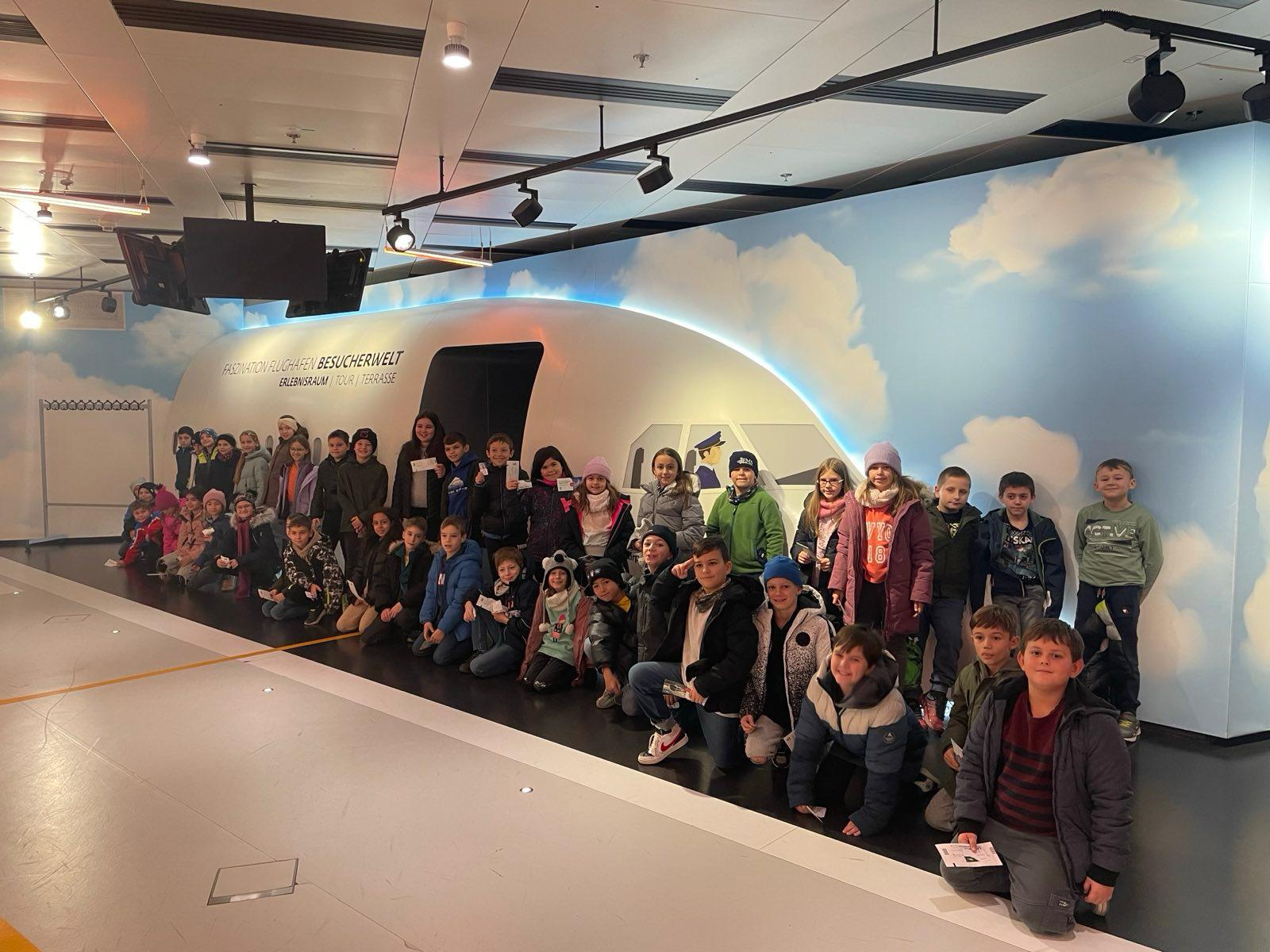 Die 3D und 3E der Volksschule Frauenfeld unternahmen einen spannenden Ausflug zur Erlebniswelt Flughafen Schwechat. Schon die Anreise mit einem Doppeldeckerbus des Flughafens Schwechat weckte Vorfreude auf einen Tag voller neuer Eindrücke. Vor Ort erhielten wir zunächst eine interessante Führung durch den Flughafen, bei der die Kinder einen Blick hinter die Kulissen werfen konnten. Besonders beeindruckend war die Fahrt mit dem Bus direkt zu den Flugzeugen auf dem Rollfeld. Dort konnten die Schülerinnen und Schüler hautnah beobachten, wie die Maschinen betankt und beladen werden. Ebenso wurden auch die Lande- und Startvorgänge verschiedener Flugzeuge beobachtet.