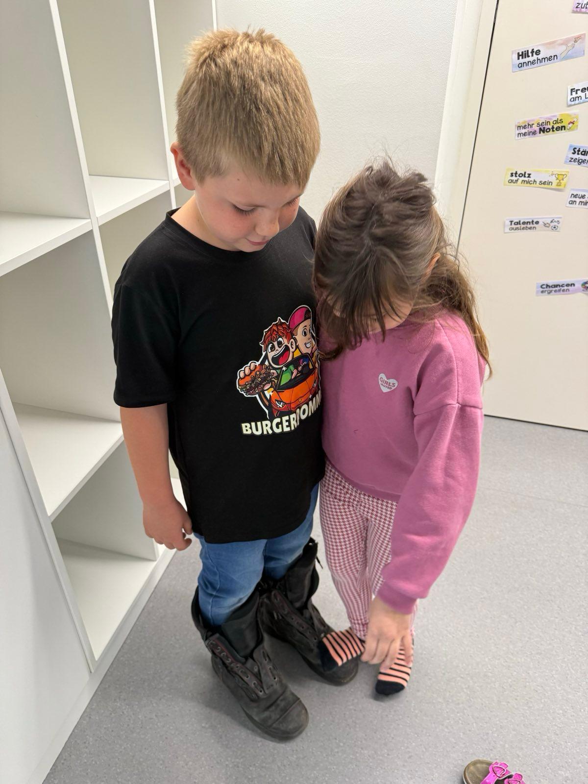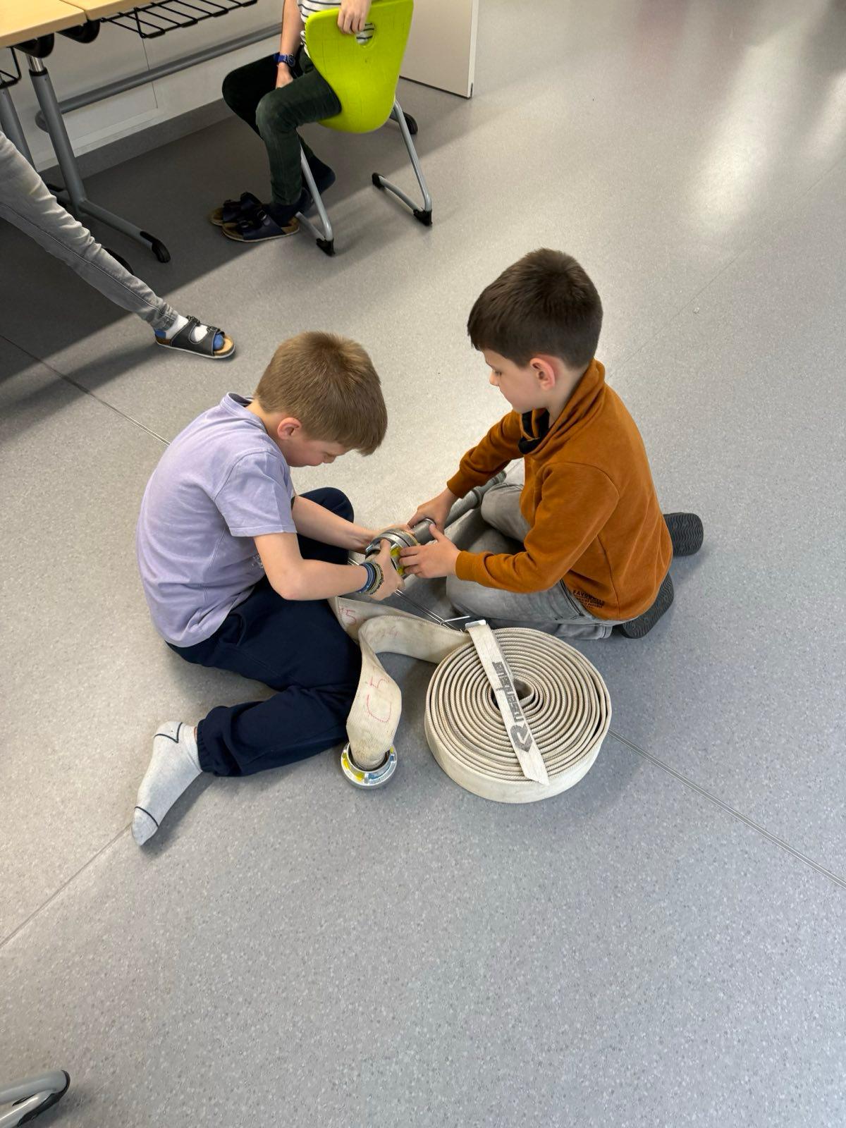 Besonders begeistert waren die Kinder davon, selbst in eine Feuerwehruniform zu schlüpfen – inklusive Helm und Feuerwehrschuhen. Ein echtes Highlight war es, an einem langen Feuerwehrschlauch entlangzugehen, um zu sehen, wie weit dieser reicht. Auch das Heben eines weiteren Schlauchs sorgte für staunende Gesichter, als die Kinder spürten, wie schwer dieser sein kann. Mit einer präparierten Atemschutzmaske konnten sie erleben, wie Feuerwehrleute bei Bränden und stark verrauchten Räumen sehen.