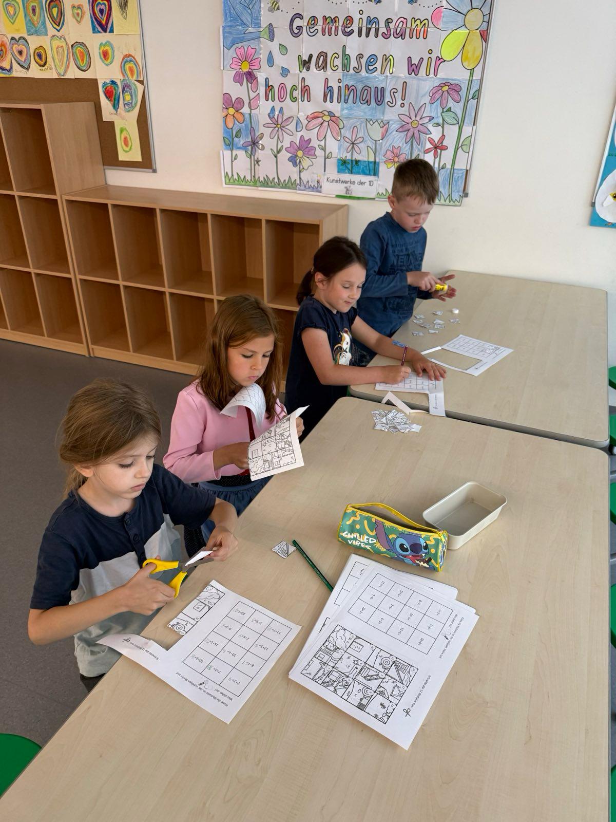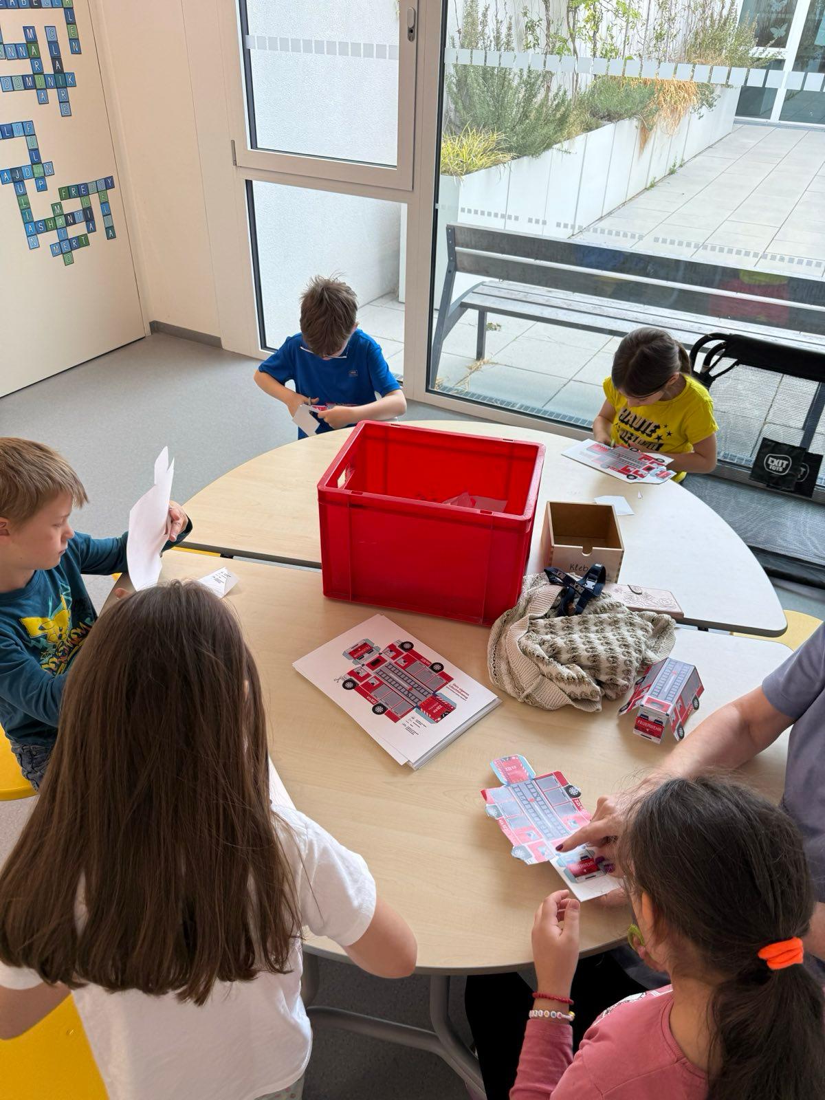 Neben den praktischen Eindrücken gab es auch viele kreative und fächerübergreifende Stationen: Ein Rechenpuzzle, ein Lückentext mit Lesetext, ein spannendes Kreuzworträtsel und eine Bastelstation, an der die Kinder ihr eigenes Feuerwehrauto gestalten konnten. So wurde das Thema Feuerwehr ganzheitlich erlebbar gemacht – mit Kopf, Herz und Hand.