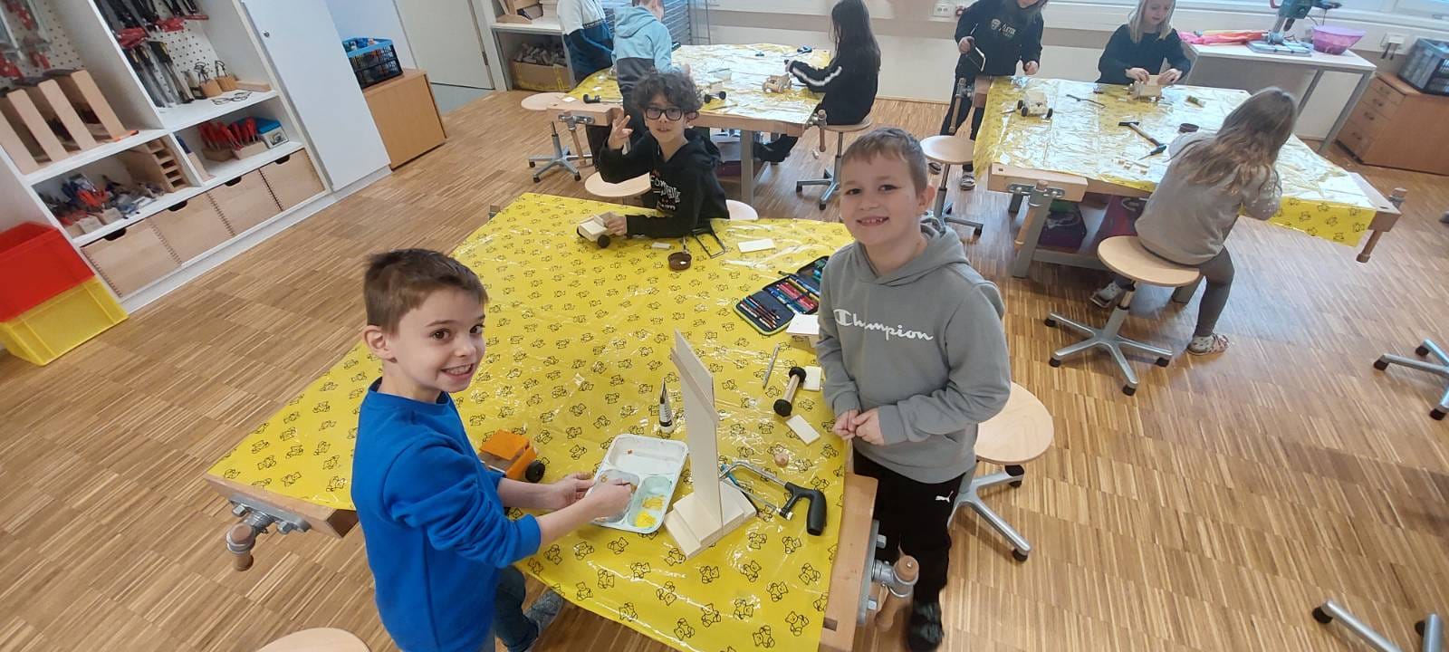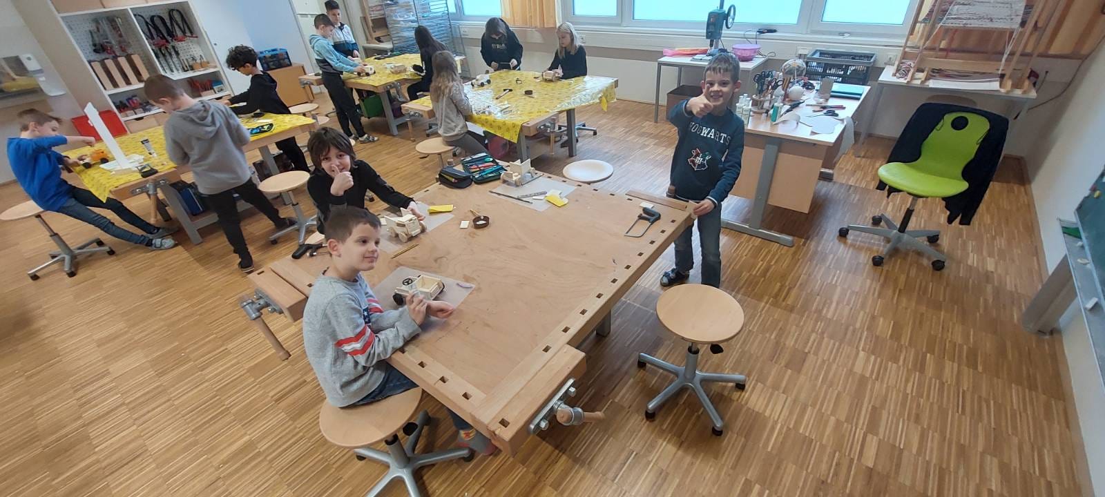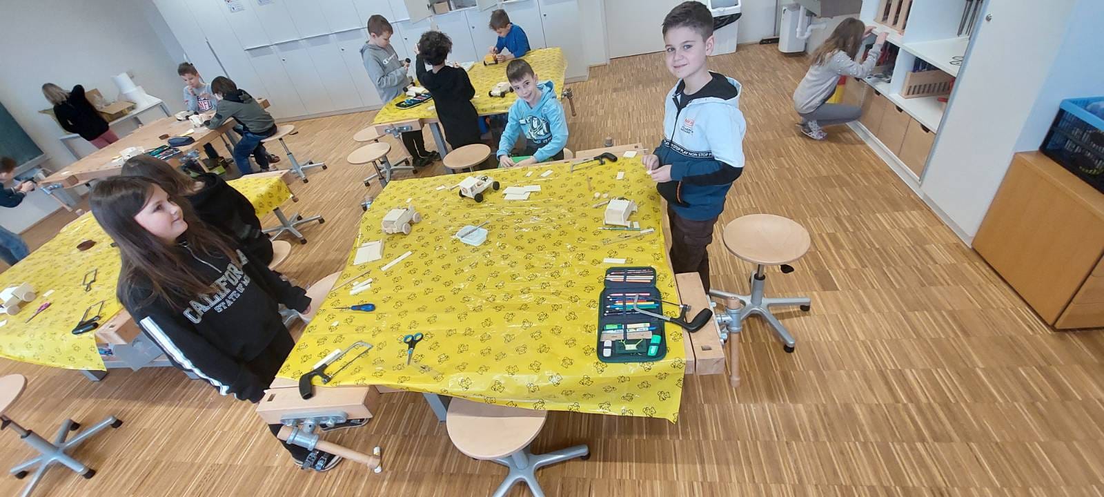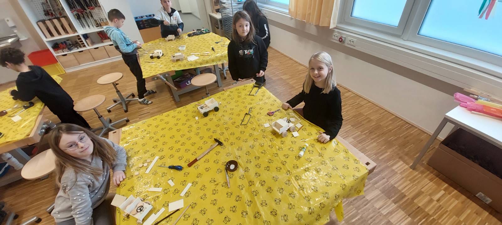 In den Stunden des technisches Werkunterrichts in der 3. Klasse wurden von den Kindern großartige Fahrzeuge hergestellt. Mit Holz, Metallstangen und Schrauben wurden bewegliche Objekte gebaut. Das Auto aus Holz mit einer lenkbaren Achse war Ziel dieser Einheit. Es entstand so ein Truck/Jeep mit oder ohne Anhänger.
