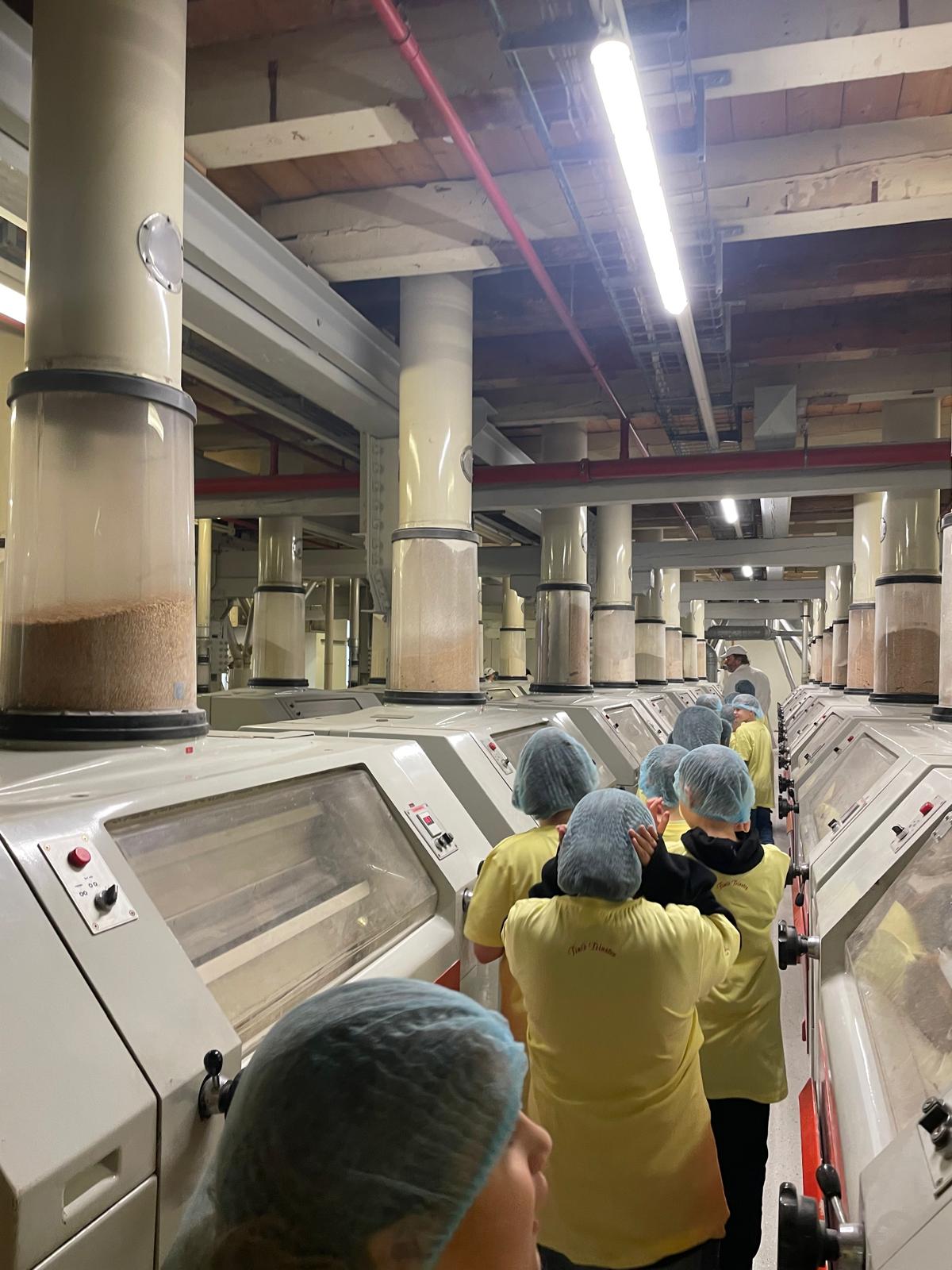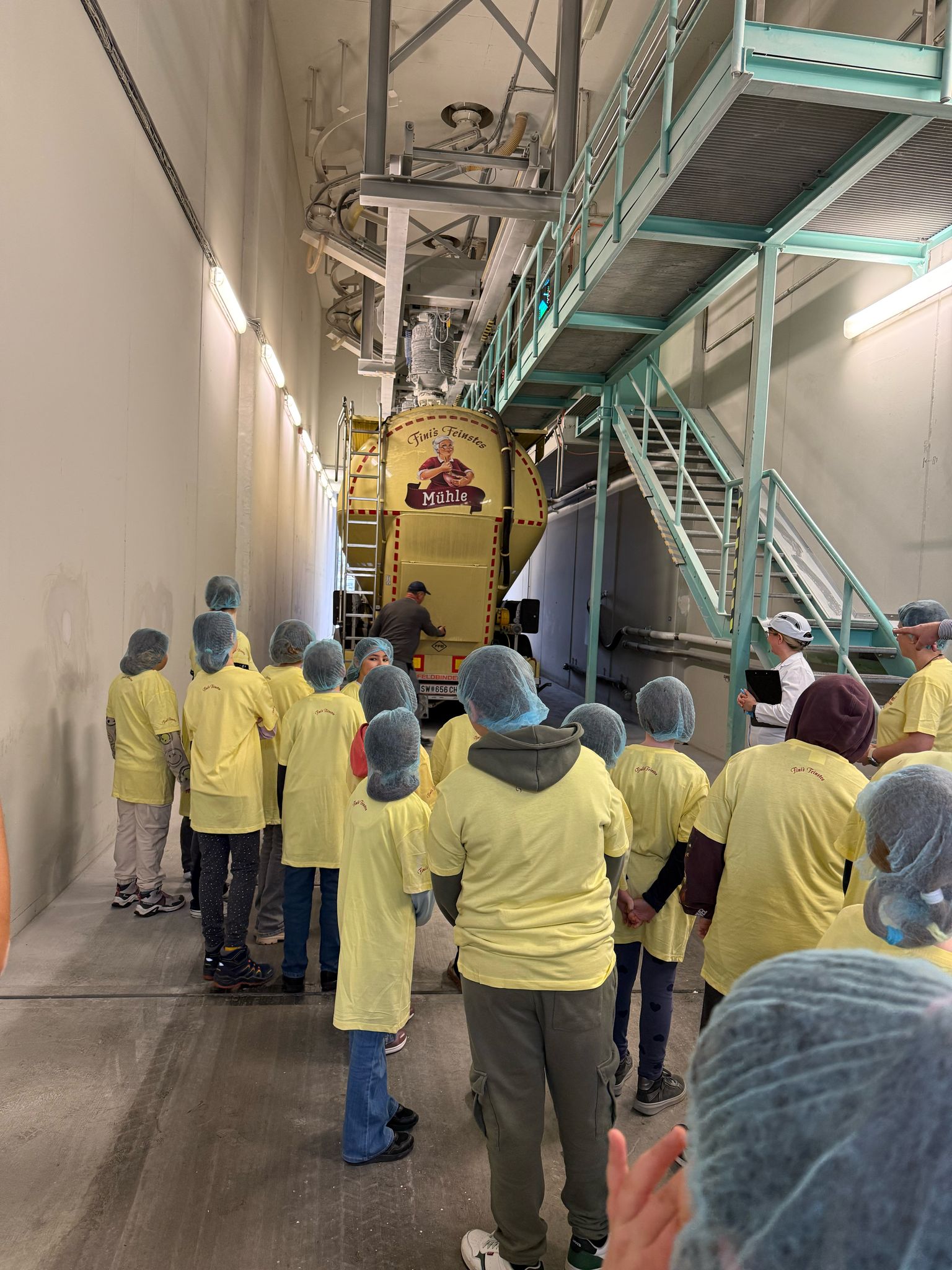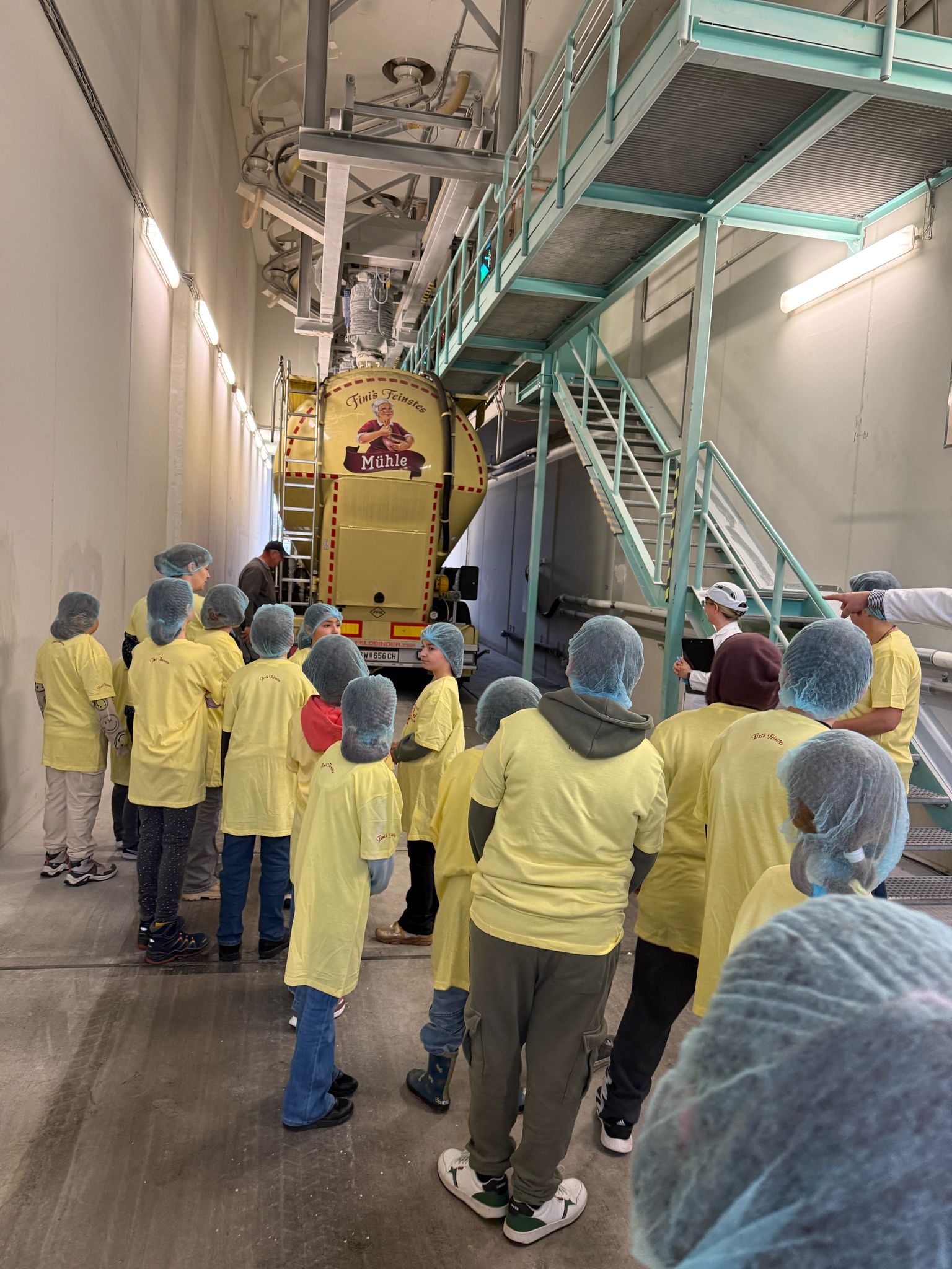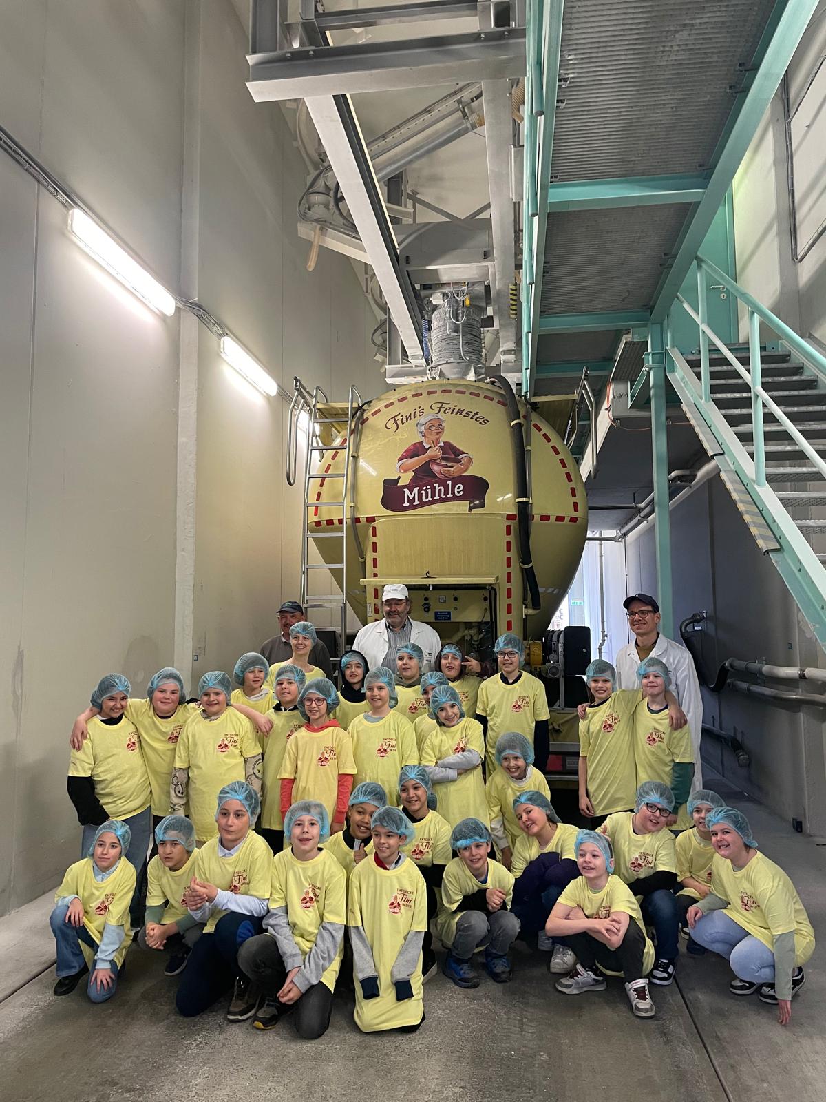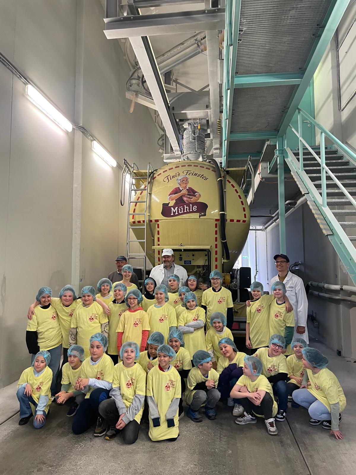 Nach einem herzlichen Empfang mit einem kleinen Frühstück erfuhren die Kinder in einer theoretischen Einführung, wie aus dem Getreidekorn Mehl entsteht. Dabei konnten sie ihr bereits vorhandenes Wissen unter Beweis stellen. Anschließend ging es – ausgestattet mit T-Shirts und Haarnetzen für die Hygiene – in die Produktion. Bei einer spannenden Führung wurden die verschiedenen Maschinen gezeigt und der gesamte Prozess vom Mahlen des Korns bis zum Abpacken und Lagern des Mehls erklärt. Ein besonderes Highlight war der Besuch des Labors, wo die Kinder beobachten konnten, wie Mehlproben überprüft werden.
