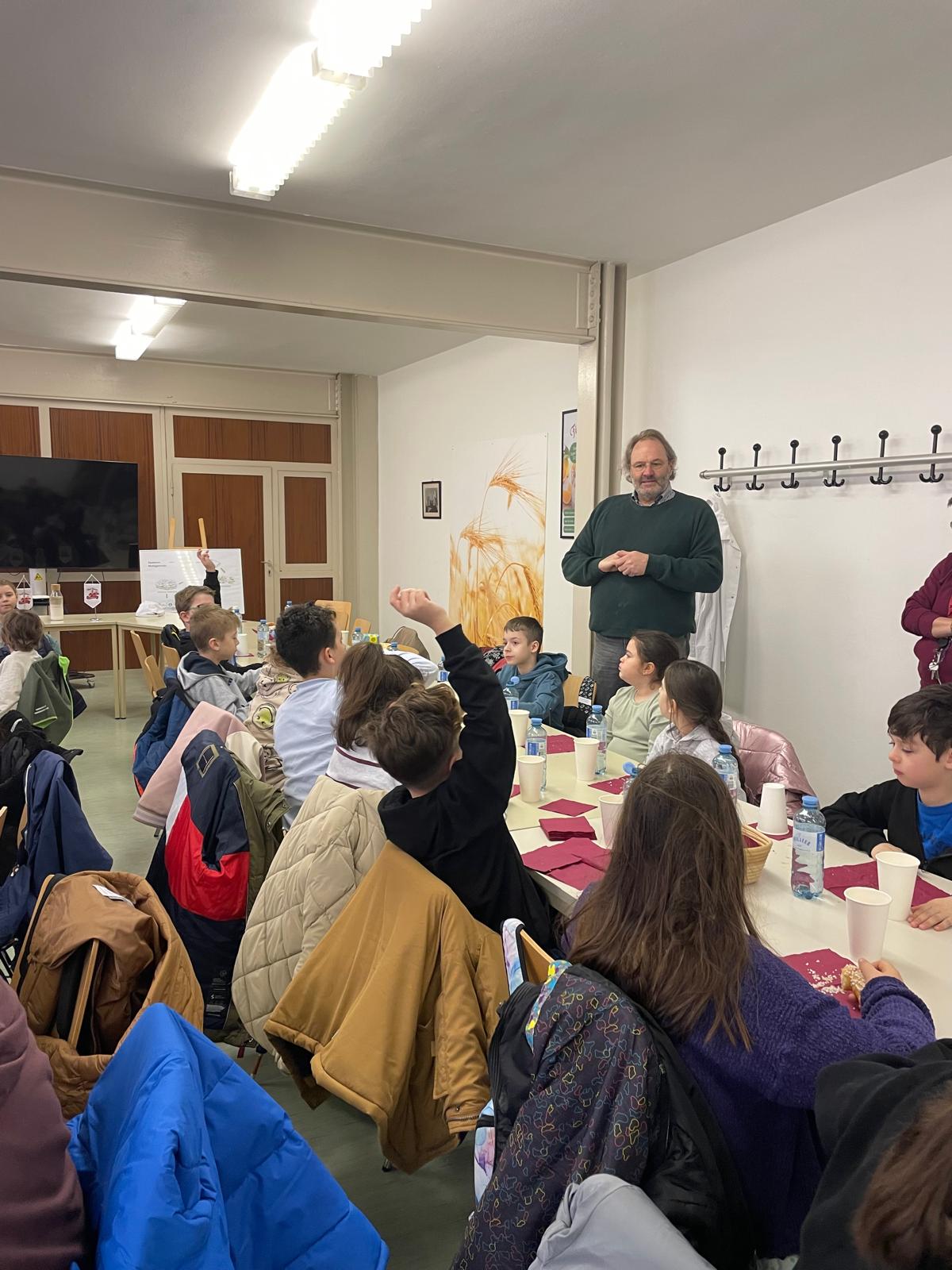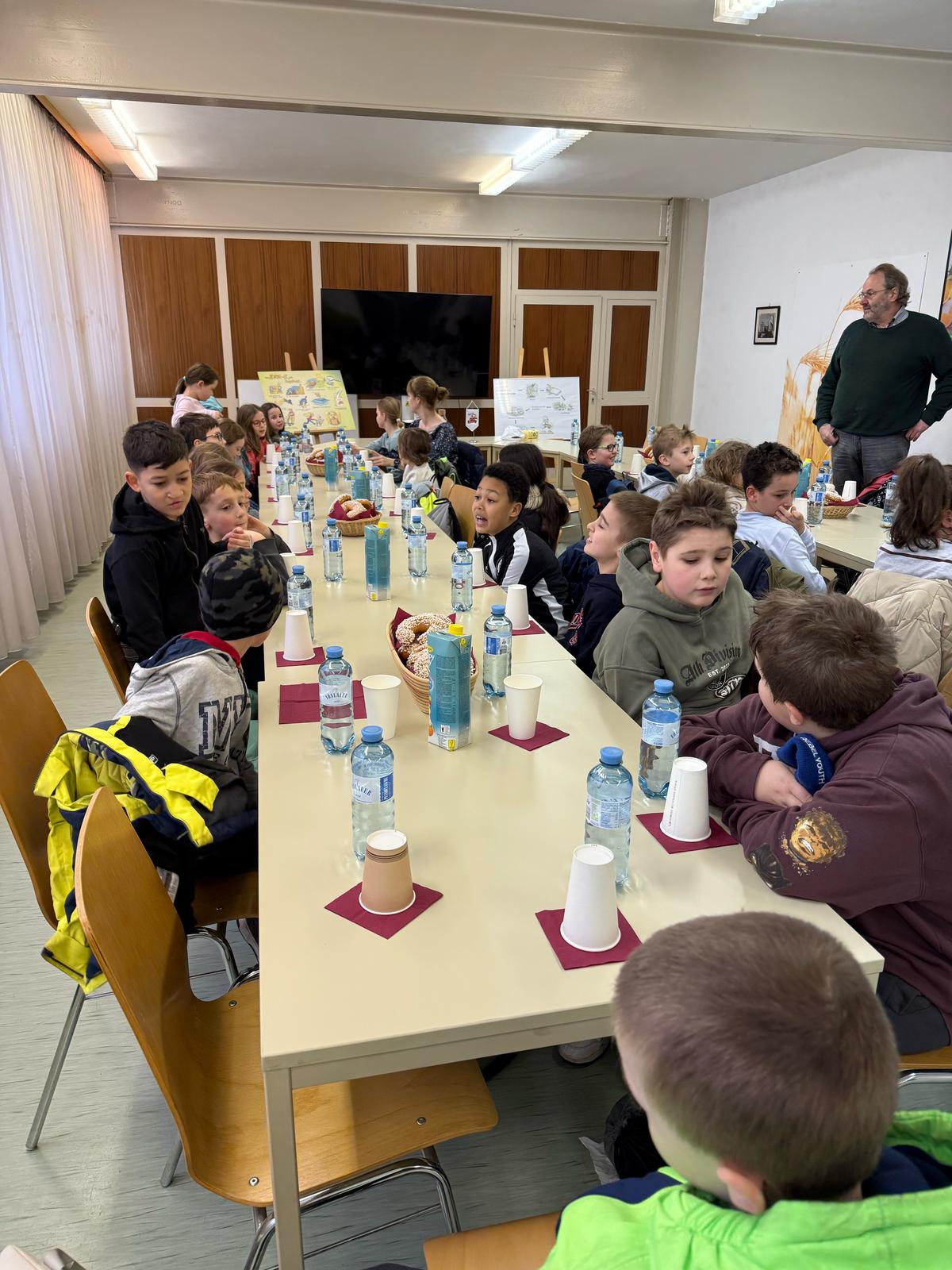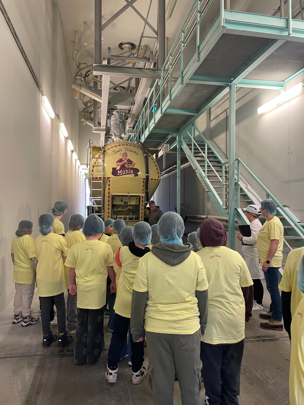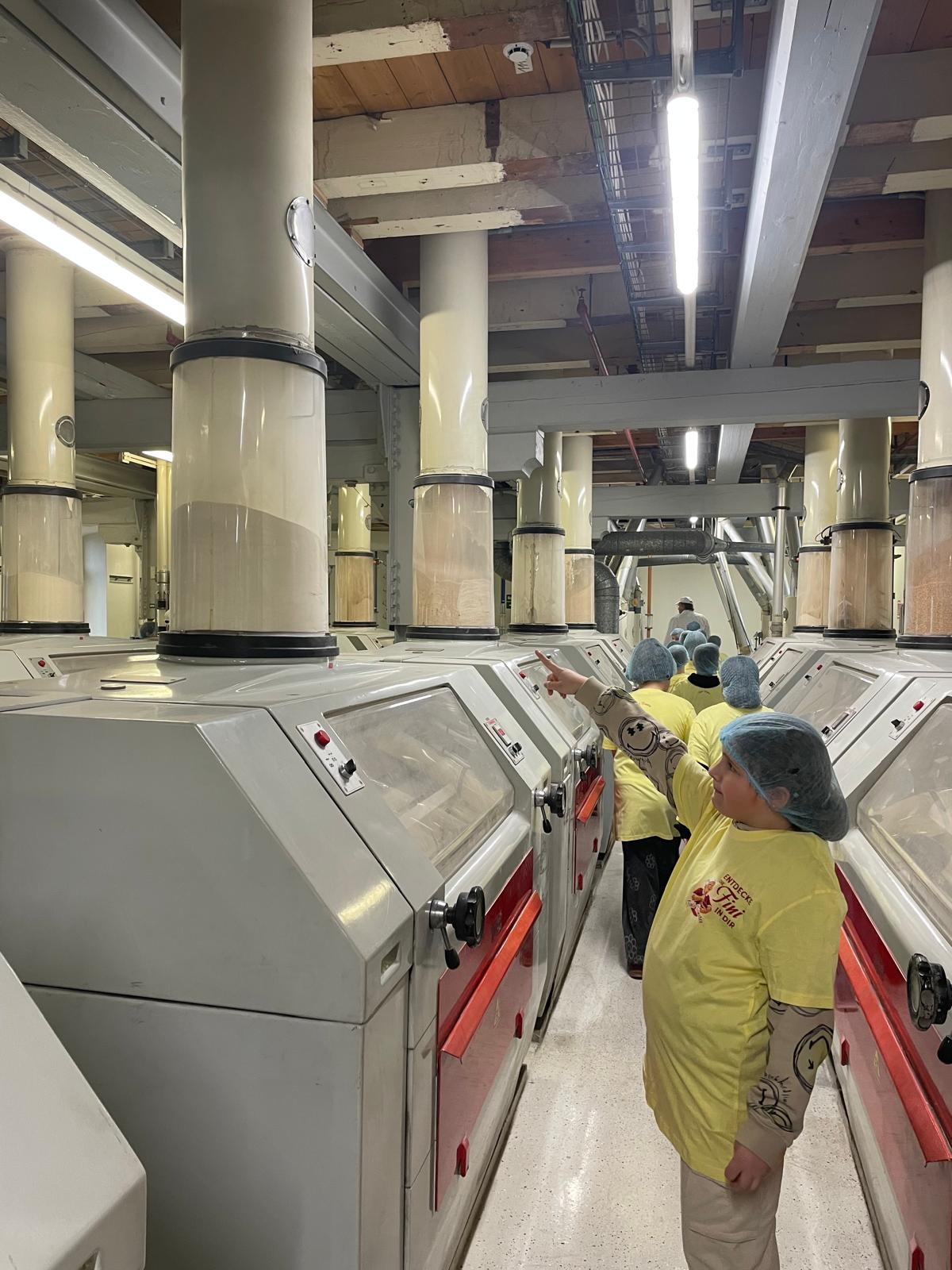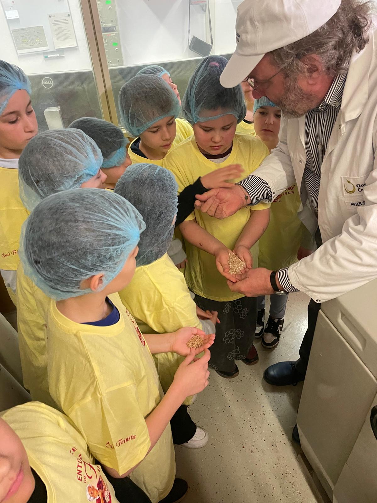 Nach einem herzlichen Empfang mit einem kleinen Frühstück erfuhren die Kinder in einer theoretischen Einführung, wie aus dem Getreidekorn Mehl entsteht. Dabei konnten sie ihr bereits vorhandenes Wissen unter Beweis stellen. Anschließend ging es – ausgestattet mit T-Shirts und Haarnetzen für die Hygiene – in die Produktion. Bei einer spannenden Führung wurden die verschiedenen Maschinen gezeigt und der gesamte Prozess vom Mahlen des Korns bis zum Abpacken und Lagern des Mehls erklärt. Ein besonderes Highlight war der Besuch des Labors, wo die Kinder beobachten konnten, wie Mehlproben überprüft werden.