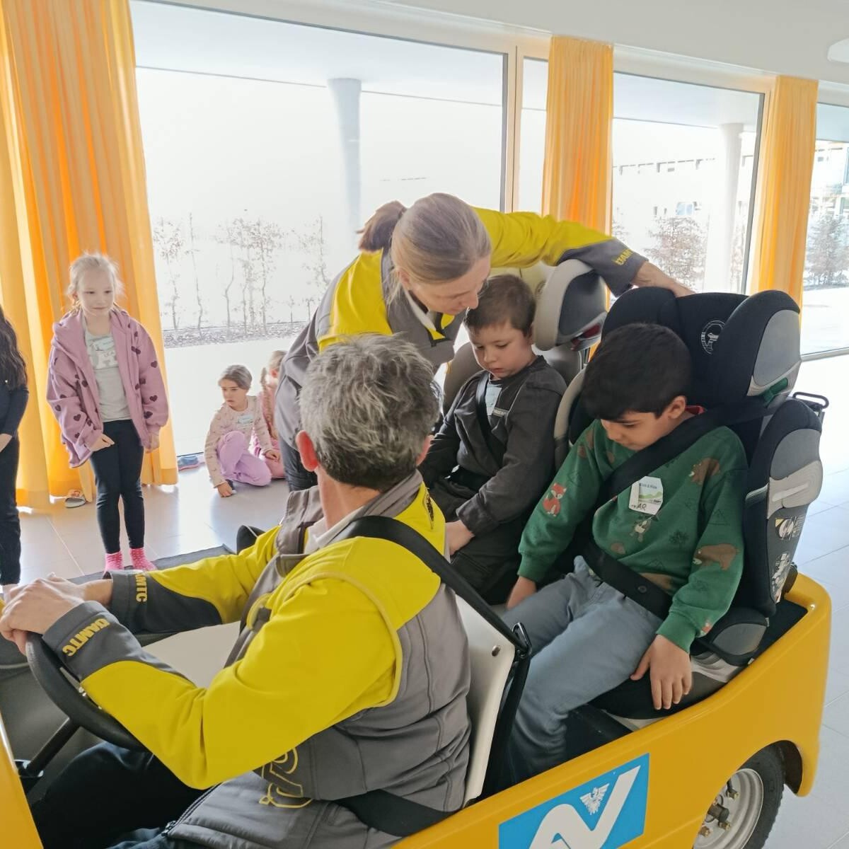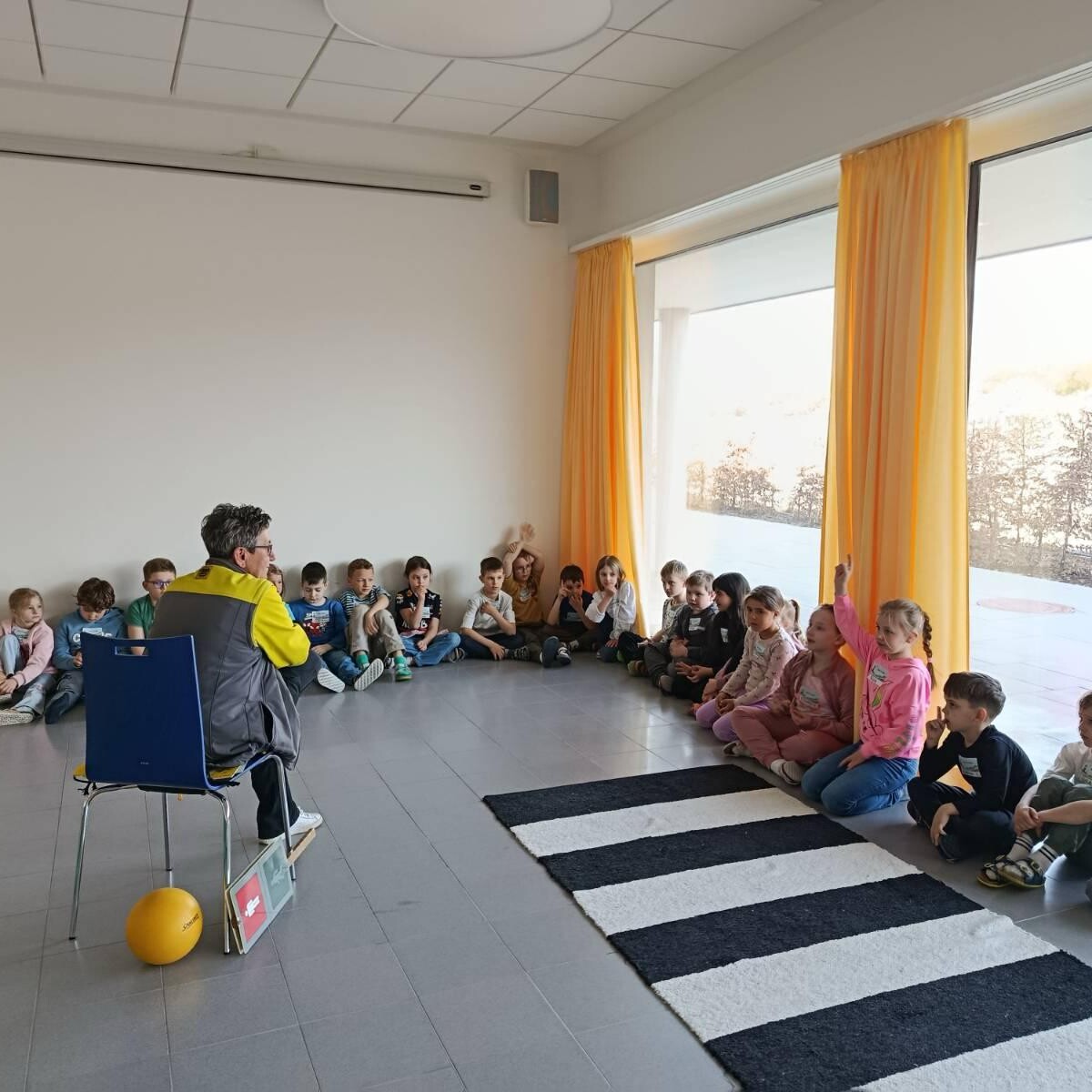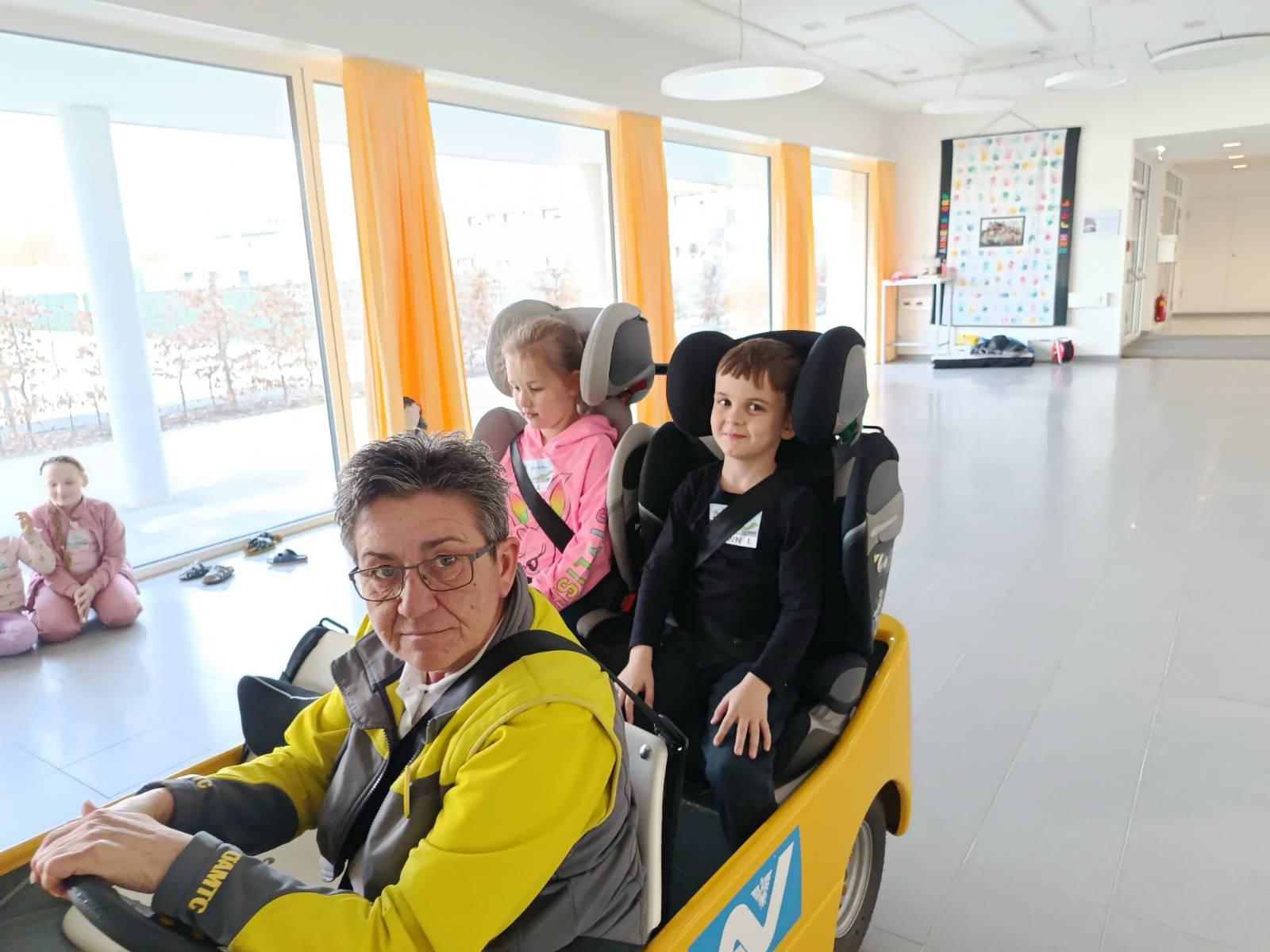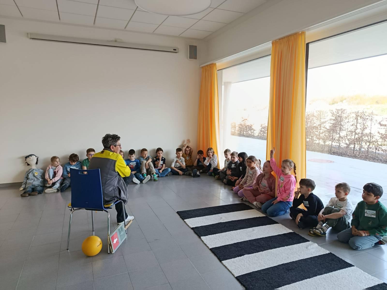 In unserer Aula wurde dafür eine realitätsnahe Verkehrssituation aufgebaut. Mit aufblasbaren Autos, Zebrastreifen und Ampeln konnten die Kinder verschiedene Alltagssituationen praktisch üben. Als Fußgängerinnen und Fußgänger trainierten sie die richtige Blicktechnik: stehen bleiben, nach links-rechts-links schauen und bewusst Blickkontakt mit Autofahrerinnen und Autofahrern herstellen.