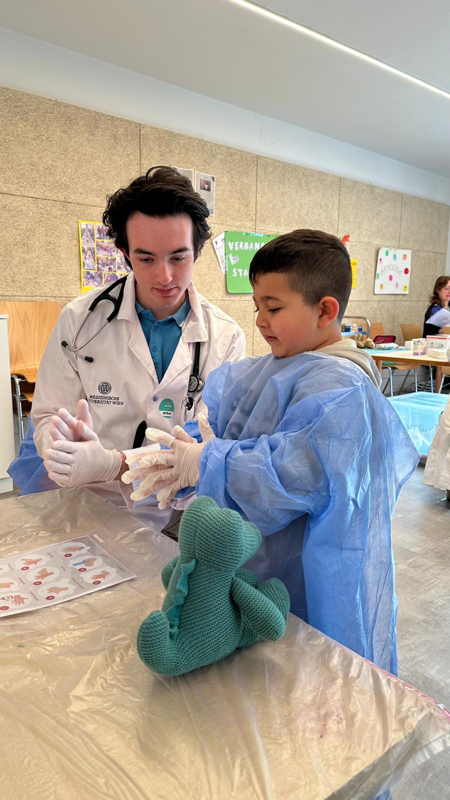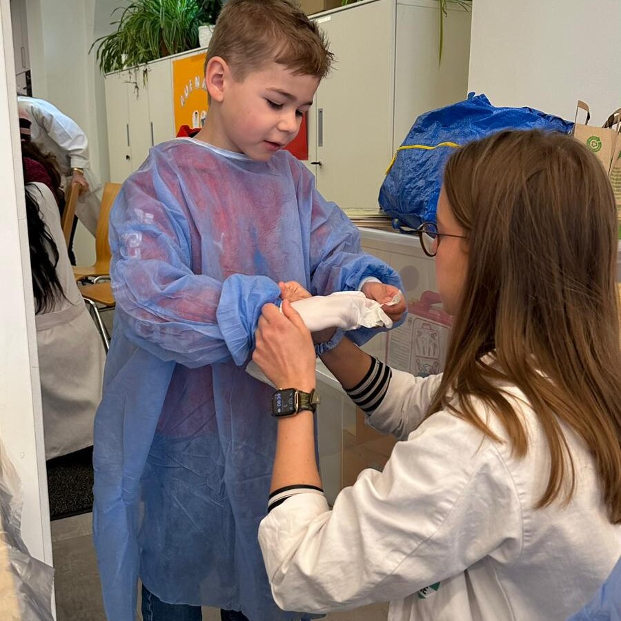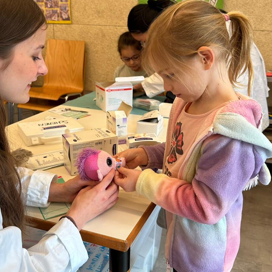Neben der Versorgung der „Patienten“ wurden auch wichtige Gesundheitsthemen vermittelt. So erfuhren die Kinder unter anderem, wie man richtig Zähne putzt und worauf beim Umgang mit Medikamenten zu achten ist. Mit viel Geduld und kindgerechten Erklärungen vermittelten die angehenden Medizinerinnen und Mediziner wertvolles Wissen für den Alltag.